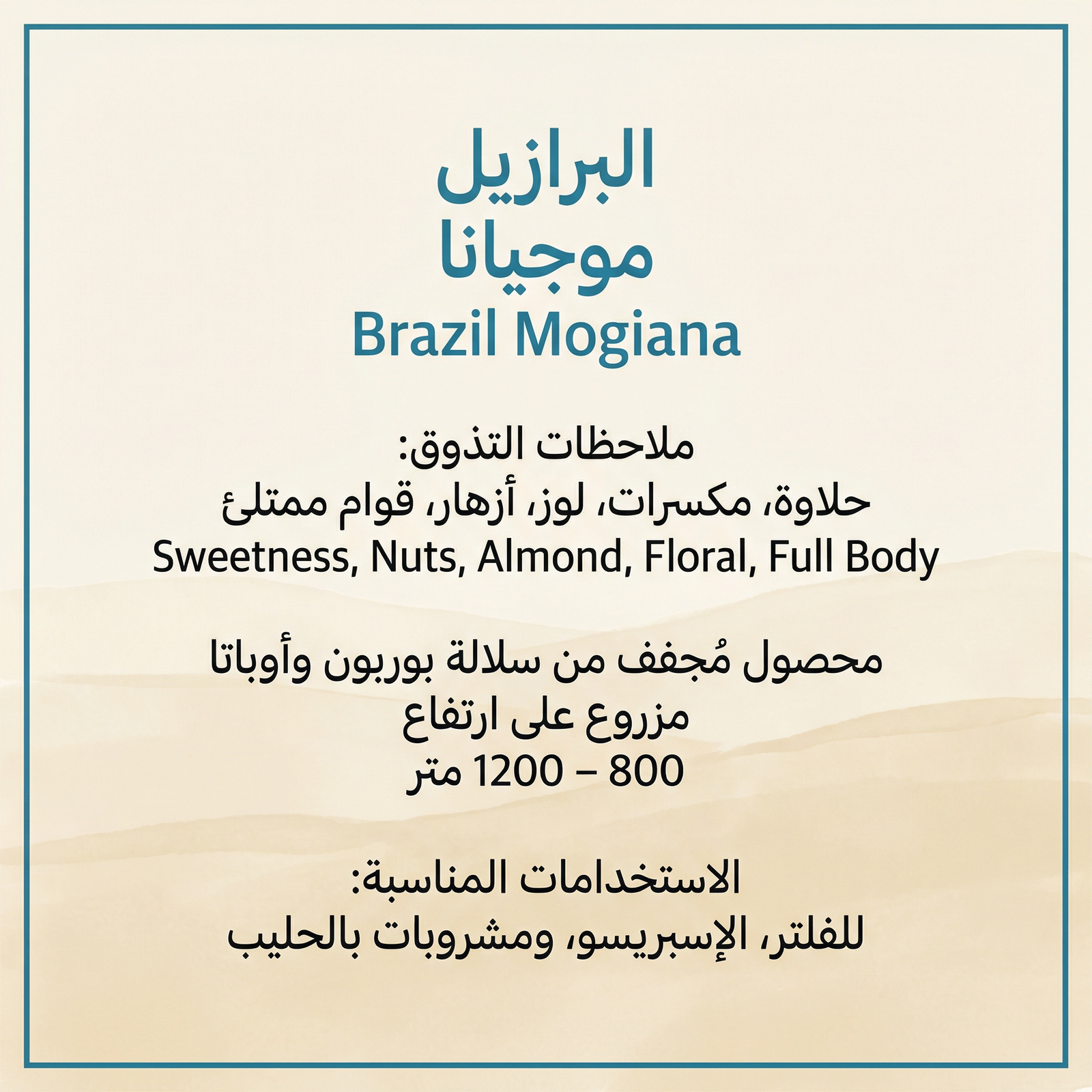 استمتع بالمذاق البرازيلي الكلاسيكي مع محصول موجيانا. تأتيك هذه القهوة من سلالتي بوربون وأوباتا، لتقدم كوباً متزناً بقوام ممتلئ وحلاوة واضحة. يتميز هذا المحصول بنقاوة طعمه وإيحاءات المكسرات واللوز مع لمسة زهرية ناعمة.